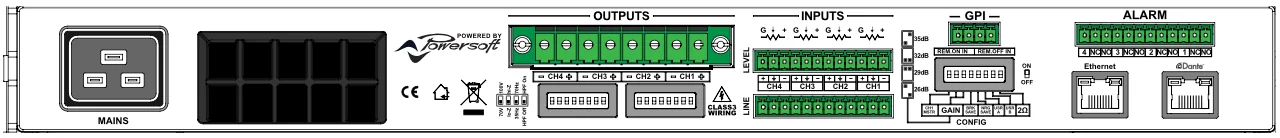 | Canales | 4 Canales de alta o baja impedancia – puente por pares 4 entradas análogas 4 entradas digitales DANTE |