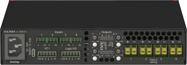 El Voltera A 300.4 es un amplificador de potencia compacto de 2 canales y medio rack de tamaño con una potencia de salida total de 300 Watts. Los canales del amplificador se pueden seleccionar individualmente para suministrar 75W por canal a 4 ohmios, 8 ohmios, 70 V o 100 V. También admite la compartición de potencia, lo que permite entregar 150 Watts en cualquiera de los canales.