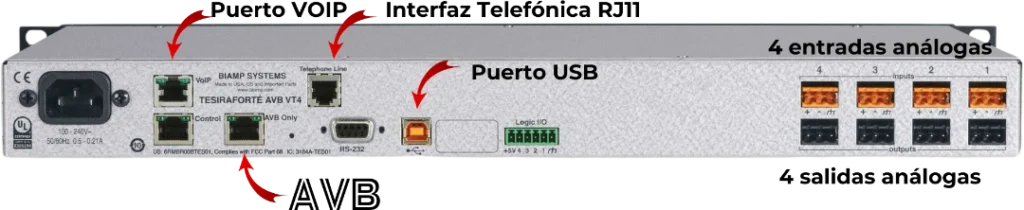 TesiraFORTÉ AVB VT4 es un servidor de audio digital (DSP de entrada/salida de audio fijo) con 4 entradas analógicas y 4 salidas analógicas, e incluye tecnología de cancelación de eco acústico (AEC) en las 4 entradas. incluye hasta 8 canales de audio USB configurables, una interfaz VoIP de 2 canales y una interfaz telefónica FXO estándar. TesiraFORTÉ AVB VT4 utiliza redes de audio digital AVB/TSN y se puede utilizar como un dispositivo independiente o combinado con otros dispositivos TesiraFORTÉ AVB y servidores, expansores, puntos finales y controladores Tesira.