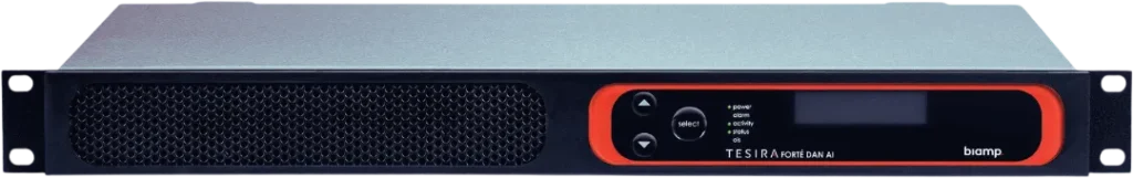 TesiraFORTÉ DAN AI es un servidor de audio digital (DSP de entrada/salida de audio fijo) con 12 entradas analógicas y 8 salidas analógicas, e incluye hasta 8 canales de audio USB configurables, cuenta con un puerto de audio digital DANTE